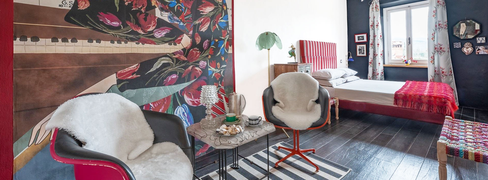 Una camera pensata per chi ama moda e arte: un corridoio di luce che corre verso i vigneti del Chianti Classico, avvolgendo l’ospite in una Toscana vibrante, fatta di colori, fantasia e libertà creativa.